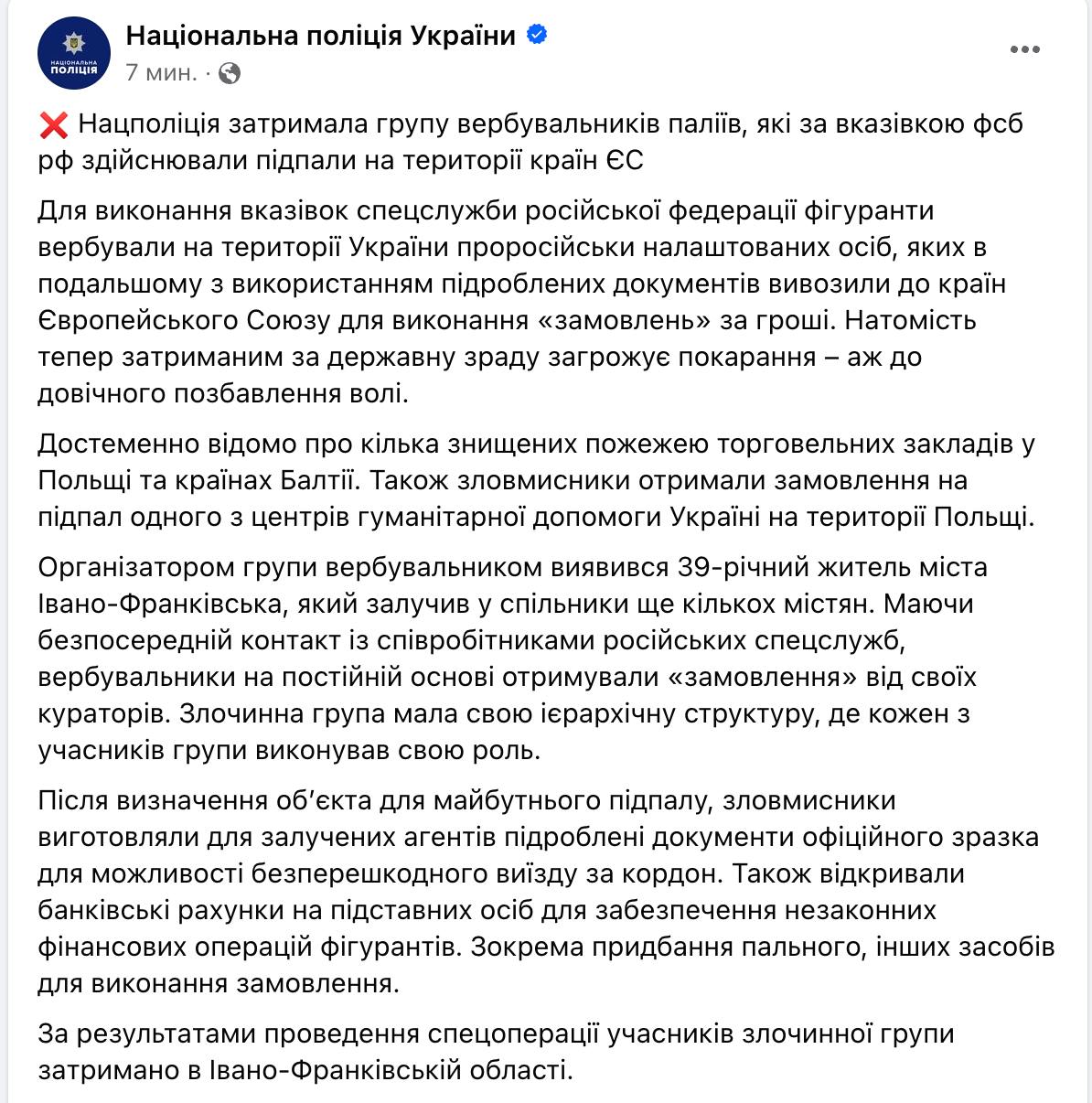По подозрению в вербовке "пророссийски настроенных лиц" для выполнения поджогов в Евросоюзе задержали 39-летнего жителя Ивано-Франковска, который привлек к этой деятельности еще нескольких украинцев.
