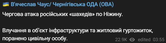 Глава Черниговской ОВА Вячеслав Чаус сообщил, что было попадание в объект инфраструктуры и жилое общежитие, ранен один человек.