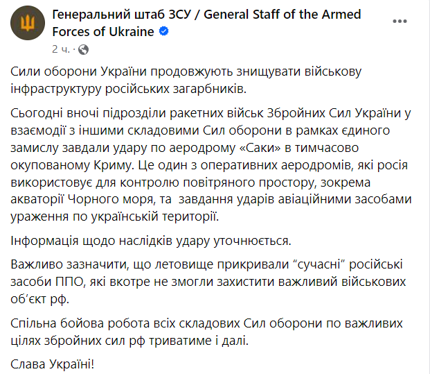 Сегодня ночью Силы обороны нанесли удар по аэродрому "Саки" во временно оккупированном Крыму.