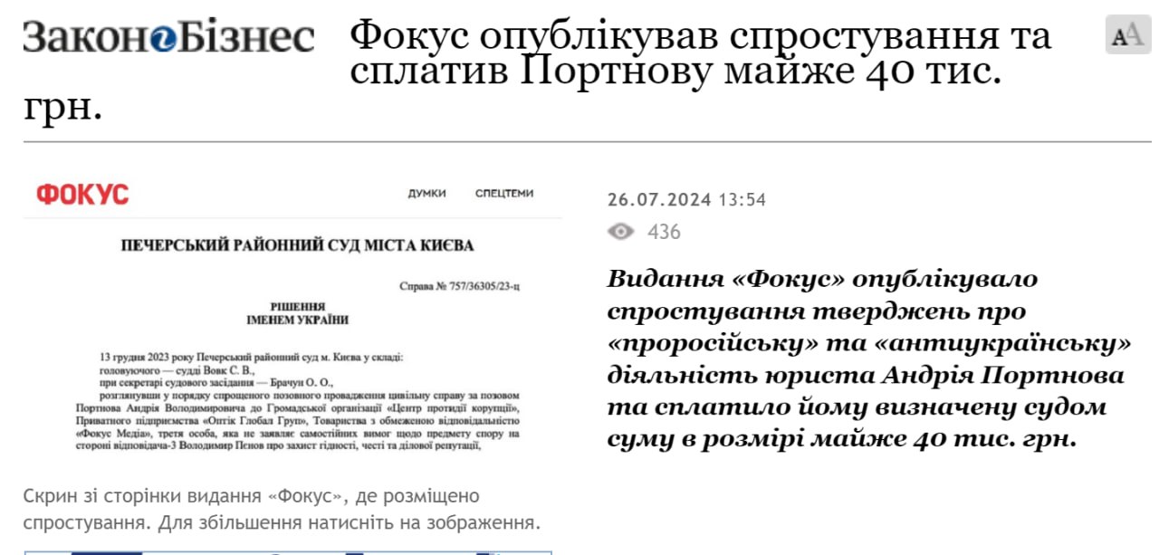 Издание "Фокус" опубликовало опровержение утверждений о пророссийской и антиукраинской деятельности юриста Андрея Портнова и уплатило ему определенную судом сумму в размере почти 40 тысяч гривен.