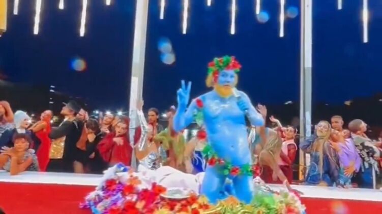 "Гвоздём" шоу стал выкрашенный в голубой цвет мужчина, который пел и танцевал на столе. После чего на церемонии спела бородатая женщина.