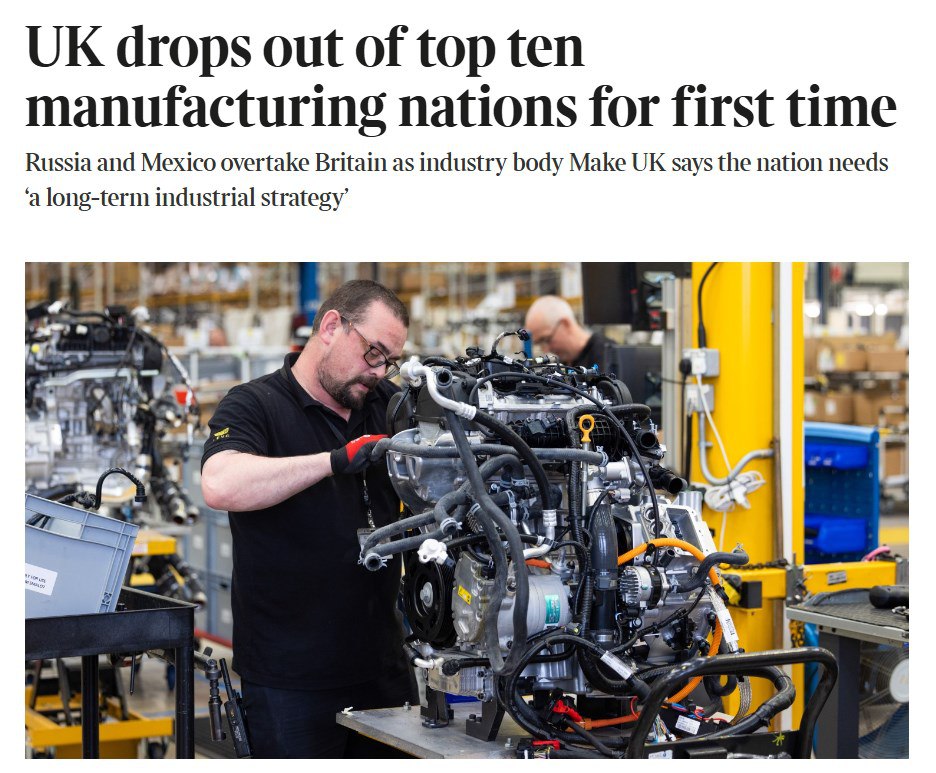 За 2022 год Британия опустилась с восьмого на 12-е место в рейтинге производящих экономик, отставая от Мексики и России, которые поднялись на седьмое и восьмое места соответственно.