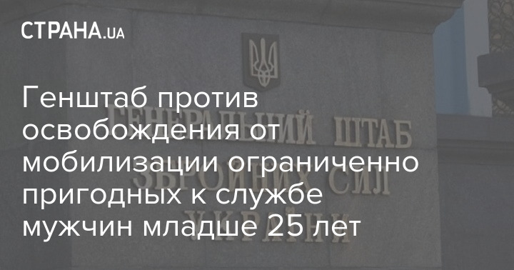 Генштаб ВСУ не поддержал законопроект, которым предлагалось освободить от мобилизации мужчин до 25 лет, ранее освобожденных от службы в мирное время, однако имевших статус ограниченно пригодных для службы в военное время.