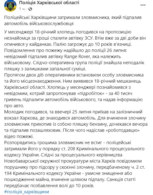 "В течение суток оперативники установили личность злоумышленника и его местонахождение. Им оказался 18-летний житель Харьковской области. Парень в мессенджере познакомился с неизвестным, который предложил "подработку" - за 40 тысяч гривен поджечь автомобиль военного и предоставил информацию об автомобиле", - говорится в сообщении.