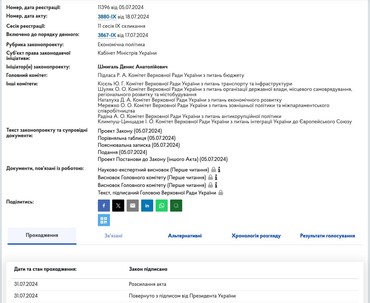 Об этом сообщается в карточке закона №111396 на сайте Верховной Рады.