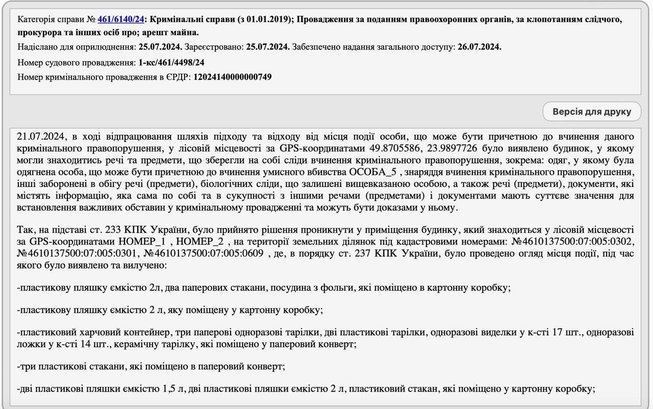 Схрон расположен в лесной местности на окраине Львова. По данным следствия, в доме могли храниться пистолет и одежда, в которой было совершено преступление. На этих предметах могли остаться следы совершения преступления, в том числе биологические. Поэтому правоохранители приняли решение провести там обыск.
