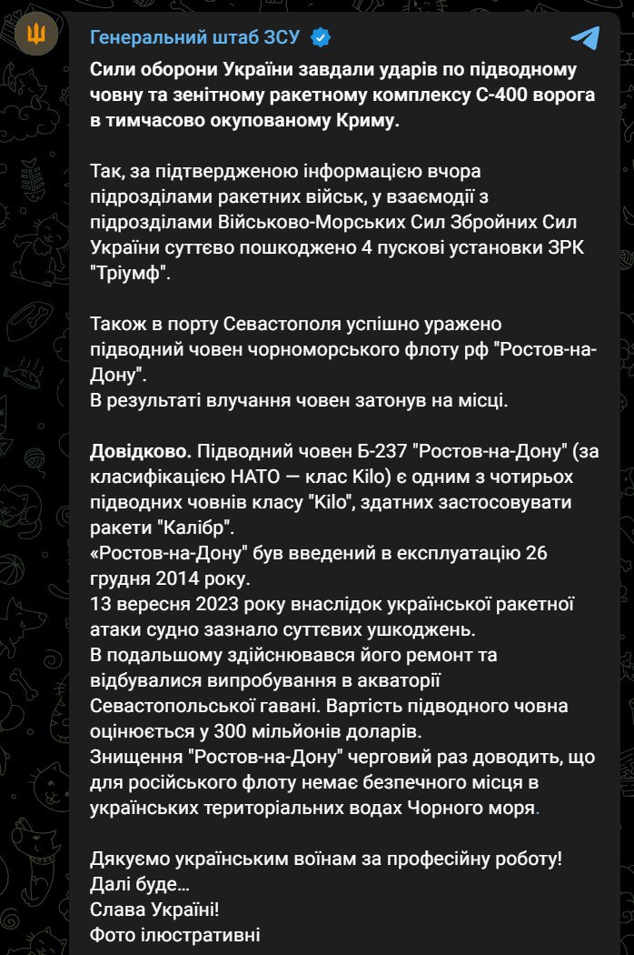 Ведомство заявляет, что была поражена подводная лодка "Ростов-на-Дону", которая затонула на месте. А также, что были "существенно повреждены" четыре пусковые установки ЗРК "Триумф".