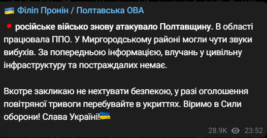 Ранее глава Полтавской ОВА Филипп Пронин сообщал, что в Миргородском районе были слышны звуки взрывов. По предварительной информации, попаданий в гражданскую инфраструктуру и пострадавших нет.