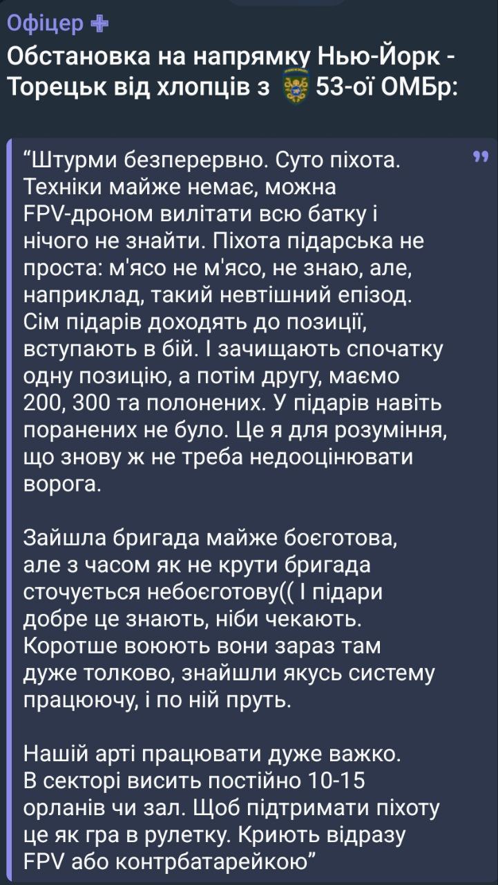 09:43 "Воюют очень толково". Украинский офицер с позывным "Алекс" передает впечатления военных 53-й ОМБр о тактике россиян на Торецком направлении.