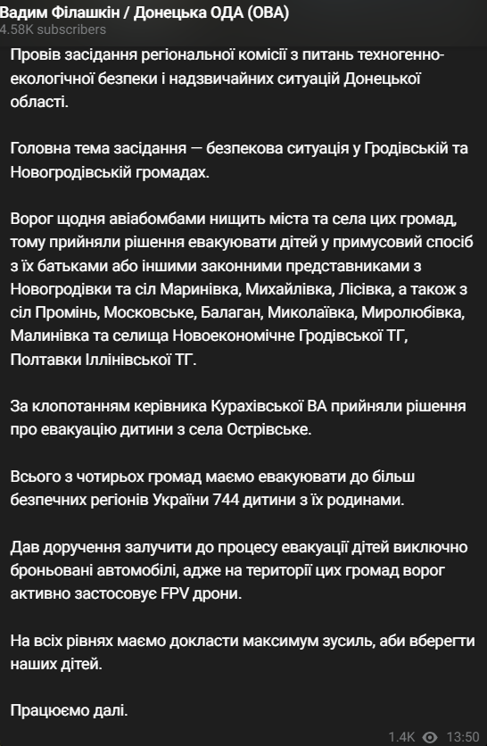 В Донецкой области объявили принудительную эвакуацию детей с родителями из прифронтовых населенных пунктов Гродовского и Новогродовского районов из-за постоянных авиаударов.