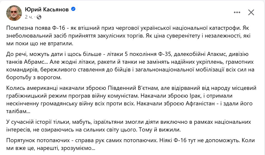Украинский волонтер Юрий Касьянов назвал появление у Воздушных сил ВСУ истребителей F-16 "утешительным призом украинской национальной катастрофы".