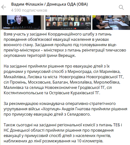 Также на заседании региональной комиссии по ТЭБ и ЧС принято решение о принудительной эвакуации детей из населенных пунктов, приближенных к линии разграничения на 10 километров. Среди них населенные пункты Селидовской, Кураховской и Ильиновской общин.