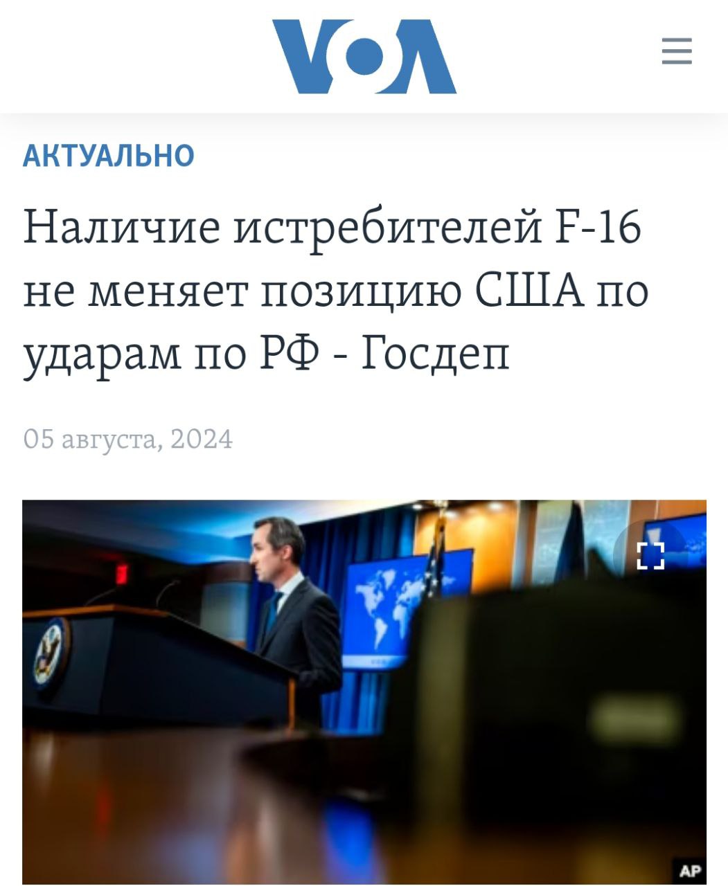 8.07 Наличие истребителей F-16 не меняет позицию США по ударам вглубь российской территории.