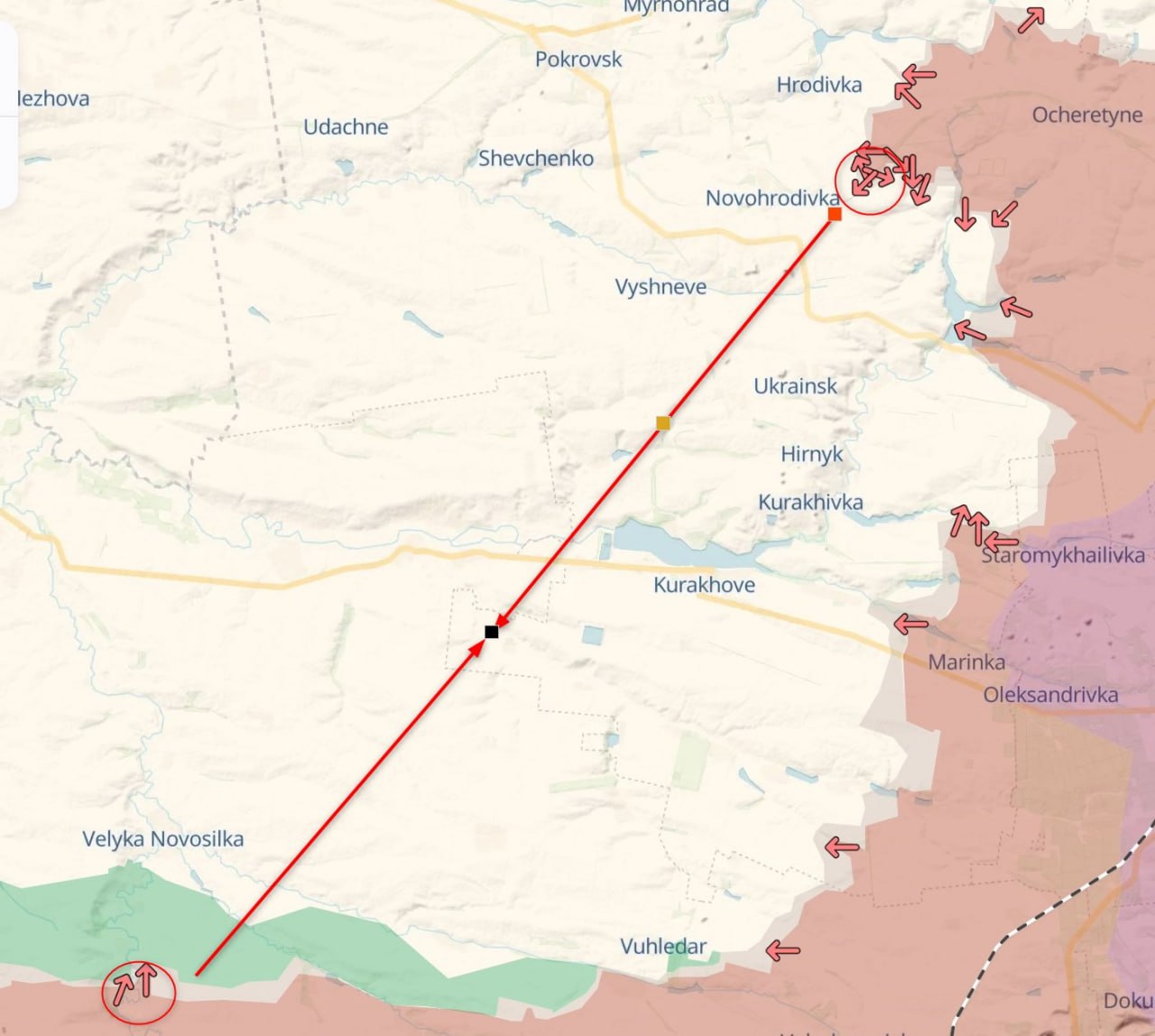 Однако, если посмотреть на карту боевых действий в динамике, то, в последнее время российские войска продвигаются, в основном, не на север (к трассе), и не на запад (к Покровску), а на юго-запад - в сторону Желанного, Николаевки, Новогродовки и т.д.