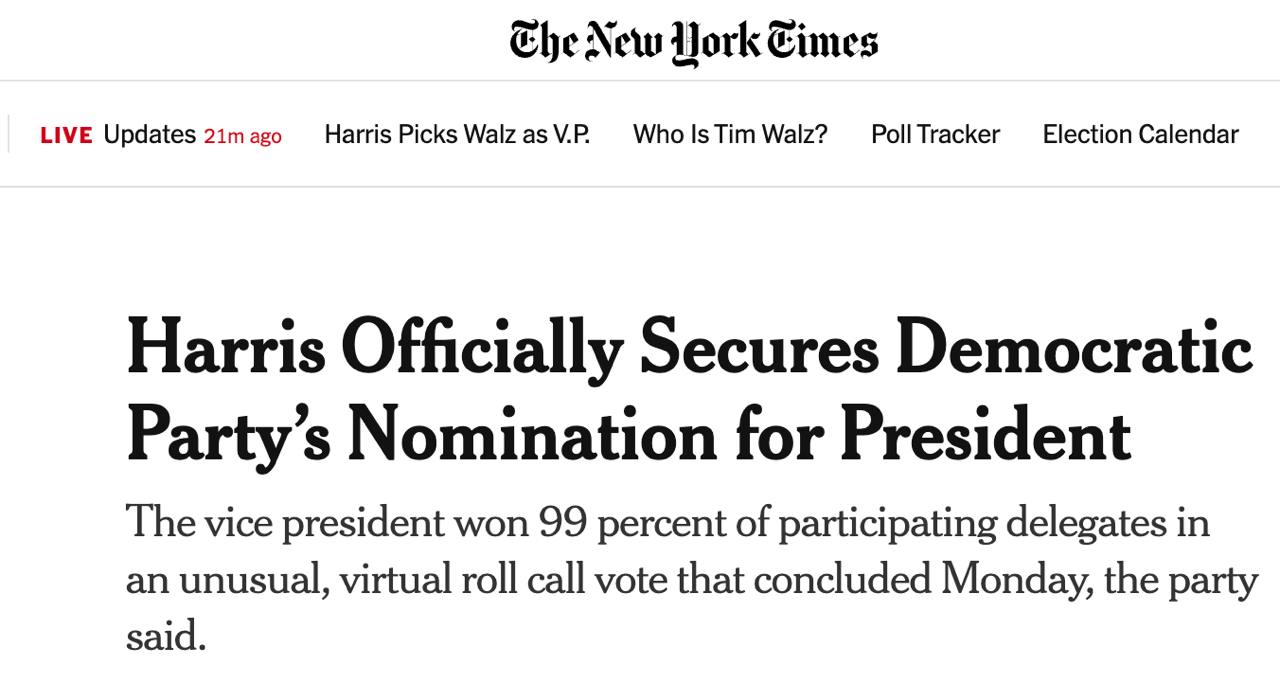 Харрис получила 99% голосов делегатов съезда партии в ходе виртуального поименного голосования.