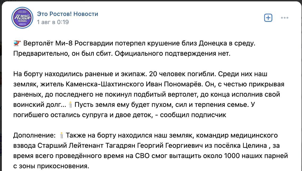 11.54 На борту сбитого дроном около Донецка российского вертолета были 20 человек, они погибли, сообщает ростовский паблик.