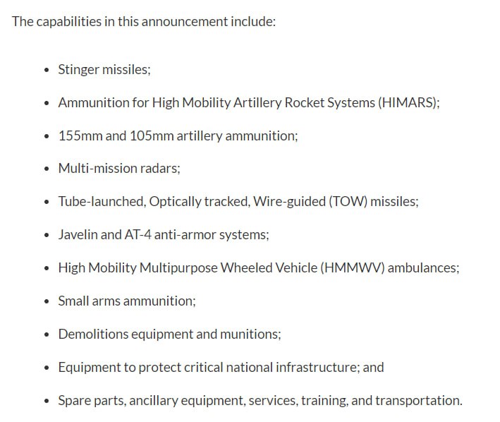"Этот пакет, ориентировочная стоимость которого составляет 125 миллионов долларов, предоставит Украине дополнительные возможности для выполнения ее насущных потребностей, в том числе средства противовоздушной обороны, многофункциональные РЛС для выявления и противодействия артиллерии противника и противотанковое оружие", - прокомментировали в ведомстве.