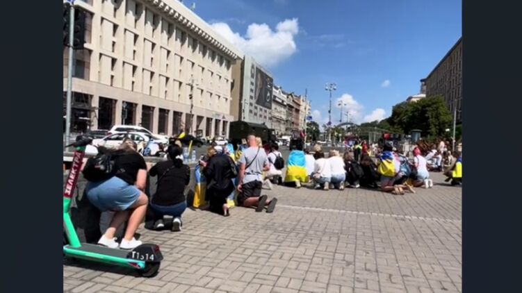 В Киеве на похоронной процессии павших украинских солдат ведущий в микрофон приказал прохожим стать на колени.
