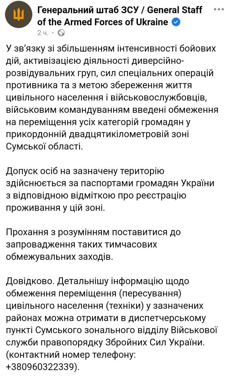Ограничения введены в связи с "увеличением интенсивности боевых действий, активизацией деятельности диверсионно-разведывательных групп" РФ, объяснили в ведомстве.