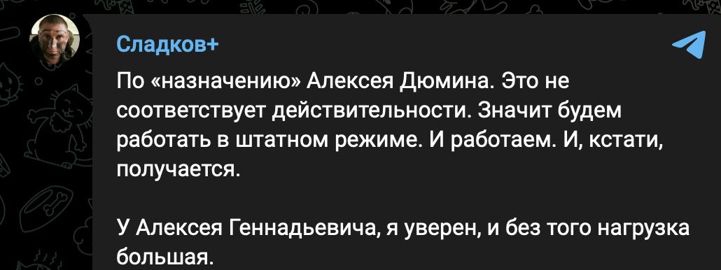 "По "назначению" Алексея Дюмина. Это не соответствует действительности", - написал военкор Александр Сладков в Телеграме.