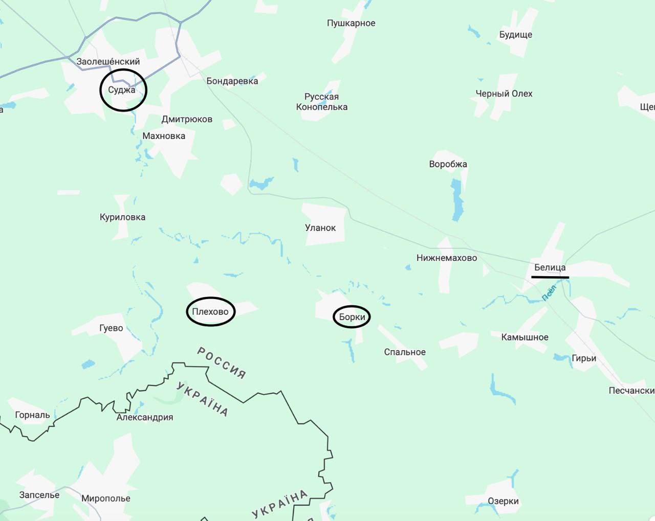 Об изменениях в районах Суджи и Коренево пока не сообщается. В направлении Льгова идут российские попытки купировать проникновение украинских ДРГ. Суджа, если оценивать по видео, которые все чаще оттуда появляются, находится под контролем Украины. При этом российские телеграм-каналы заявляют, что Украина не смогла взять Мартыновку к северу от Суджи по курской трассе.