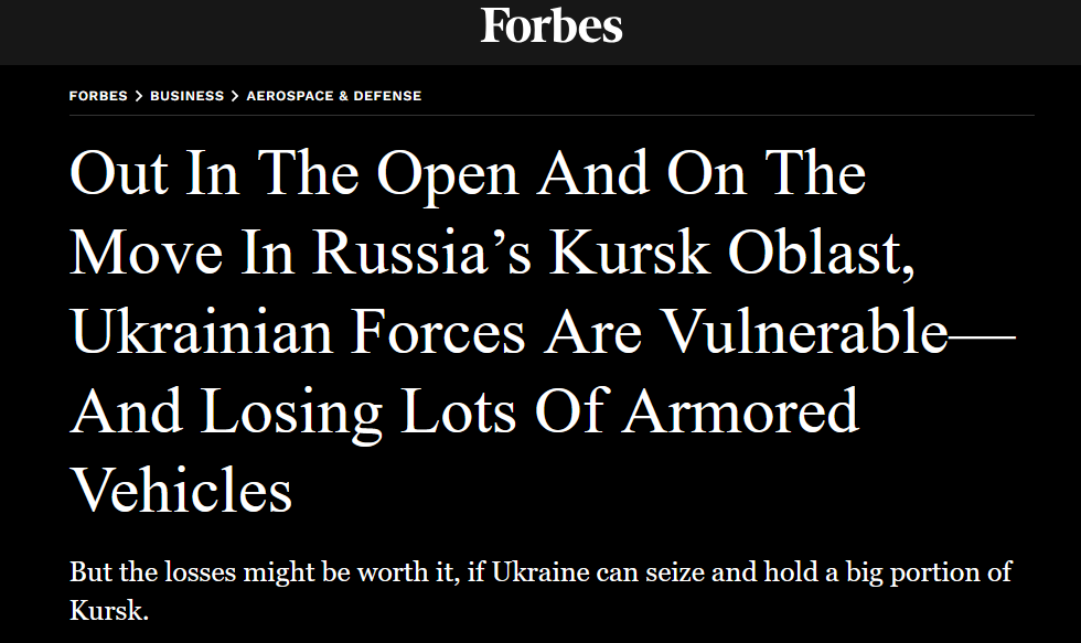 17:03 ВСУ несут значительные потери военной техники в Курской области, пишет обозреватель Дэвид Экс в материале для журнала Forbes.