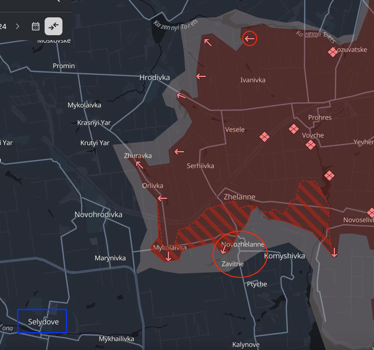 Наступление, как мы уже писали, идет в сторону города Селидово. Российские войска вплотную подошли к трассе, которая ведет в Покровск со стороны Карловки, к югу от которой находится Селидово.