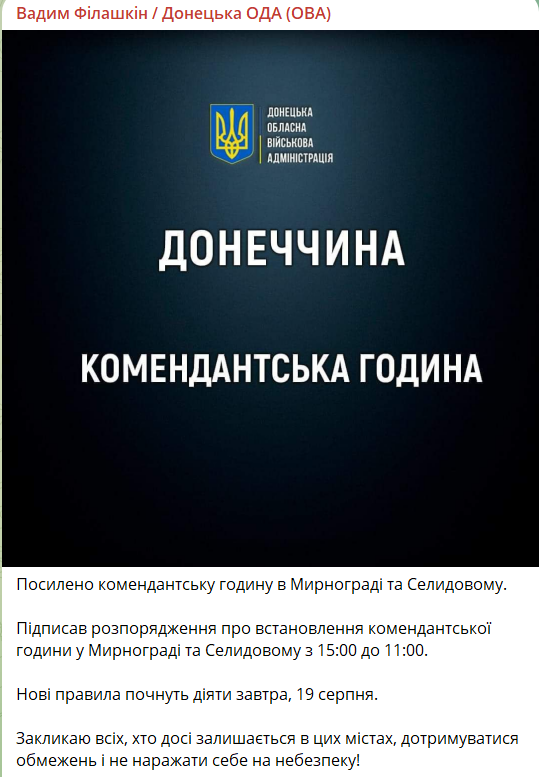 Как сообщил начальник Донецкой ОВА Вадим Филашкин, с 19 августа комендантский час в Мирнограде и Селидово будет с 15:00 до 11:00.