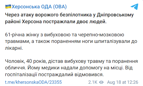 14:37 Россияне атаковали с беспилотника Днепровский район Херсона. Пострадали два человека. Об этом сообщает Херсонская ОВА.