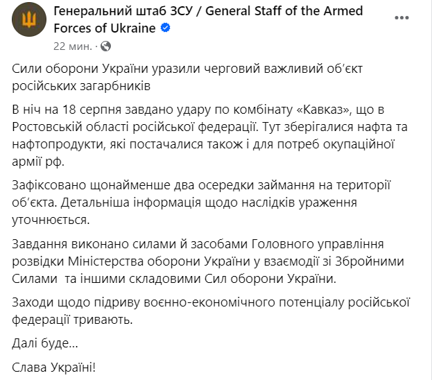 Сообщается, что поражен комбинат "Кавказ", хранились нефть и нефтепродукты. Зафиксировано по меньшей мере две ячейки возгорания на территории объекта.