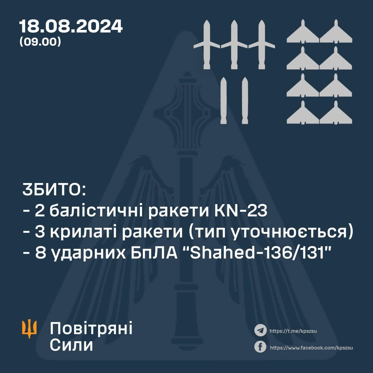 09:36 За ночь ВСУ сбили пять из восьми ракет, сообщают Воздушные силы. А также все восемь "Шахедов".