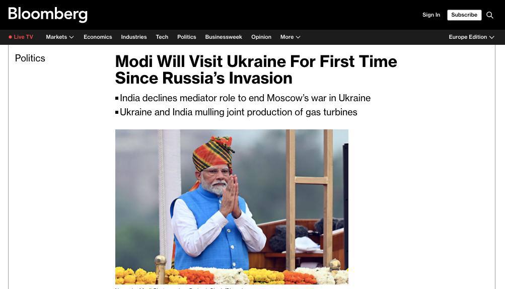 По данным Bloomberg, Моди может передать Владимиру Зеленскому послание от Владимира Путина в ходе грядущего визита в Киев. При этом премьер Индии "исключил возможность посредничества в прекращении войны", но согласился передавать послания между президентами Украины и России.