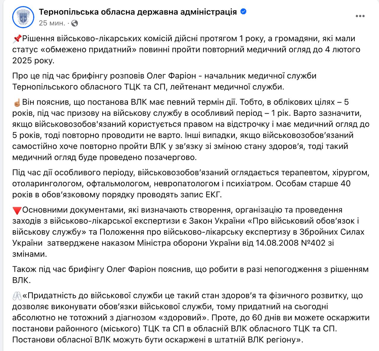 Ограниченно пригодные должны пройти повторную медкомиссию до 4 февраля 2025 года.
