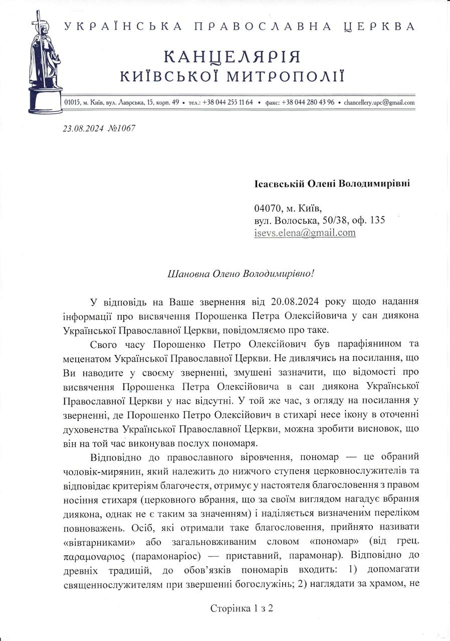 Адвокат Елена Исаевская подала запрос УПЦ с вопросом, был ли Порошенко рукоположен в диаконы церкви.