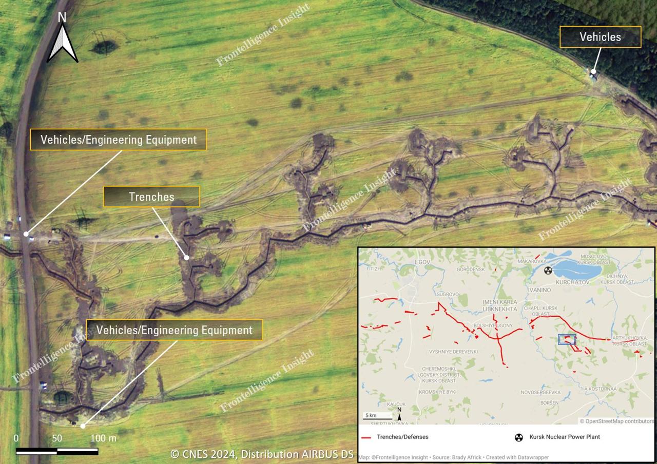 Украинский военный блогер Frontelligence Insight со ссылкой на спутниковые кадры опубликовал карту российских укреплений возле Курской АЭС.