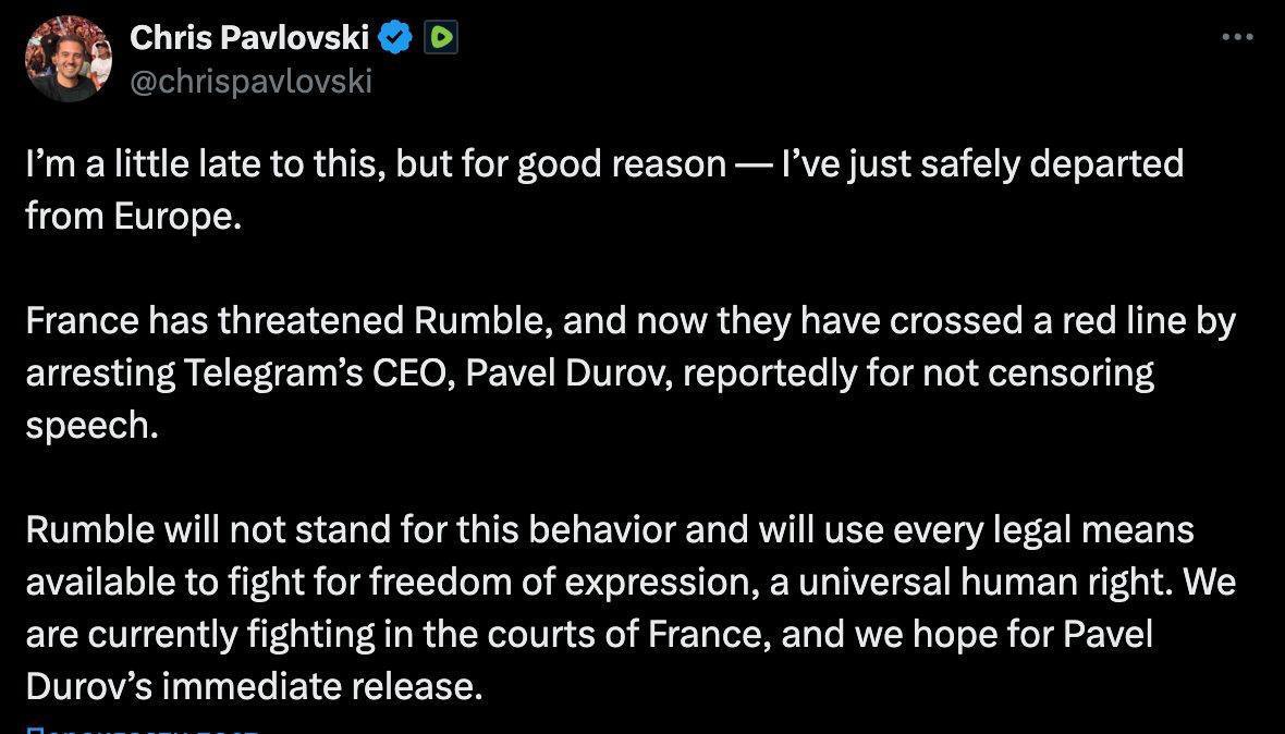 "Франция угрожала Rumble, и теперь они пересекли красную линию, арестовав генерального директора Telegram Павла Дурова якобы за то, что он не цензурировал выступления. Сейчас мы боремся в судах Франции и надеемся на немедленное освобождение Павла Дурова", - написал Павловски.