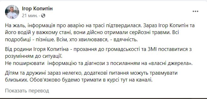 Также на странице нардепа в Фейсбуке написали, что Игорь Копытин и его водитель находятся в тяжелом состоянии после ДТП.