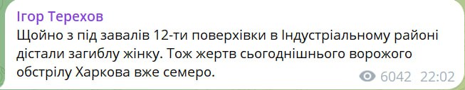 15.55 В Харькове трое погибших от прилетов, сообщает мэр Терехов.