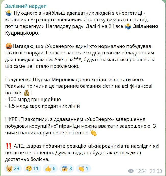 Напомним, на днях украинские издания со ссылкой на источники в Кабинете министров и одной из энергокомпаний писали, что Владимира Кудрицкого могут уволить из-за "ненадлежащей защиты" подстанций от ударов россиян. Отмечалось, что на заседании Ставки верховного главнокомандующего поднимался вопрос энергетики и Кудрицкого обвиняли в плохой защите объектов "Укрэнерго".