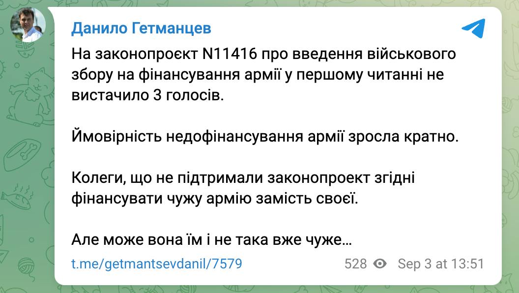 Об этом сообщает народный депутат Даниил Гетманцев.