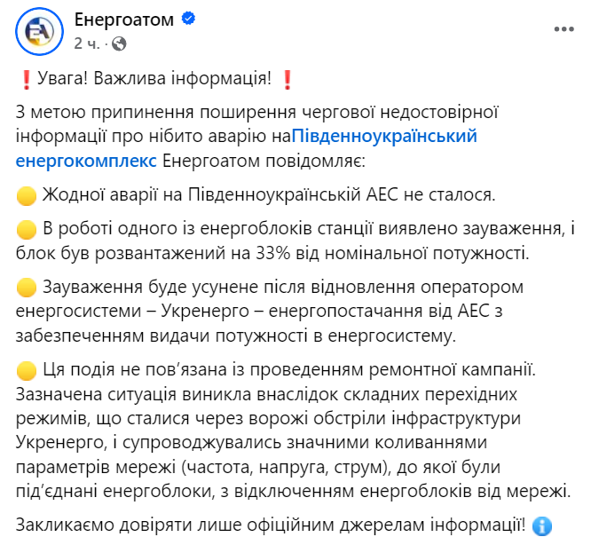 Заявлено, что данная ситуация не связана с ремонтом, а возникла "в результате сложных переходных режимов" из-за российских обстрелов, которые "привели к значительным колебаниям