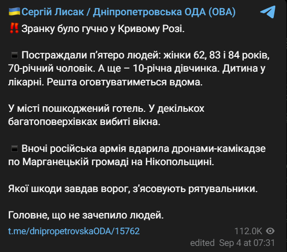 Об этом сообщает глава Днепропетровской ОВА Сергей Лысак.