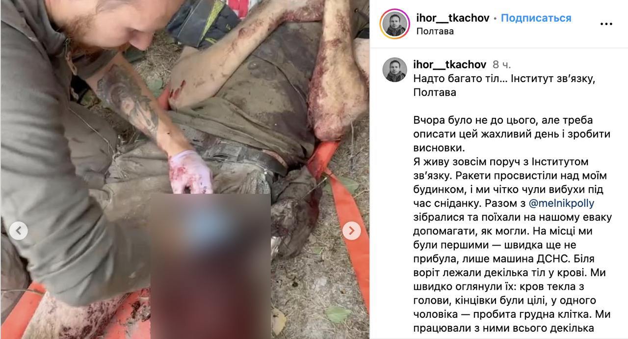 Медик добровольческого батальона "Госпитальеры" Игорь Ткачёв рассказал о первых минутах после прилёта по Институту связи в Полтаве и заявил, что погибших могло быть меньше, если бы использовалось качественное оборудование для спасения раненых и подготовка медиков была лучше.