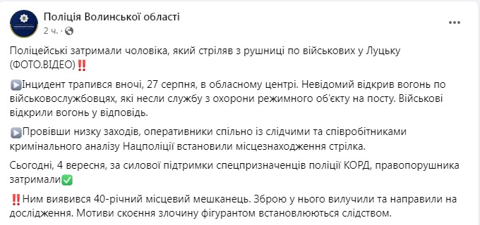 "Проведя ряд мероприятий, оперативники совместно со следователями и сотрудниками уголовного анализа Нацполиции установили местонахождение стрелка. Сегодня, 4 сентября, при силовой поддержке спецназовцев полиции КОРД, правонарушителя задержали. Им оказался 40-летний местный житель. Оружие у него изъяли и направили на исследования. Мотивы совершения преступления фигурантом устанавливает следствие", - сказано в публикации.