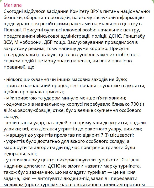 20:56 Подробности ситуации с ударом по военному институту связи в Полтаве, озвученные на закрытом заседании оборонного комитета Рады, опубликовала замглавы комитета Марьяна Безуглая.