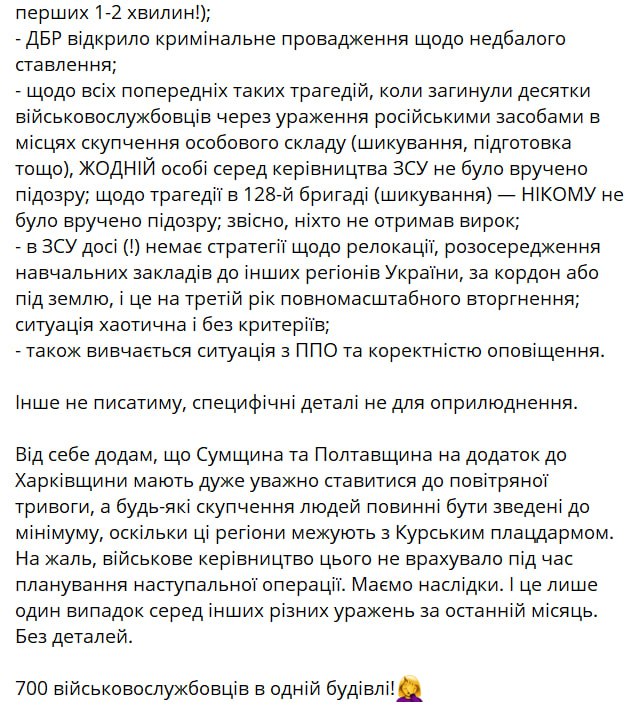 – в отношении всех предыдущих таких трагедий, когда погибли десятки военнослужащих из-за поражения российскими средствами в местах скопления личного состава (построение, подготовка и т.п.), ни одному лицу среди руководства ВСУ не было вручено подозрение. В том числе никому не было вручено подозрение по делу о трагедии в 128-й бригаде (построение). И, конечно, никто не получил приговор;