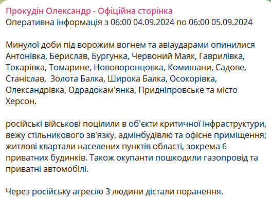 В прошедшие сутки россияне обстреливали Антоновку, Берислав, Бургунку, Красный Маяк, Гавриловку, Токаревку, Томарино, Нововоронцовку, Камышаны, Садовое, Станислав, Золотую Балку, Широкую Балку, Осокоровку, Александровку, Одру.