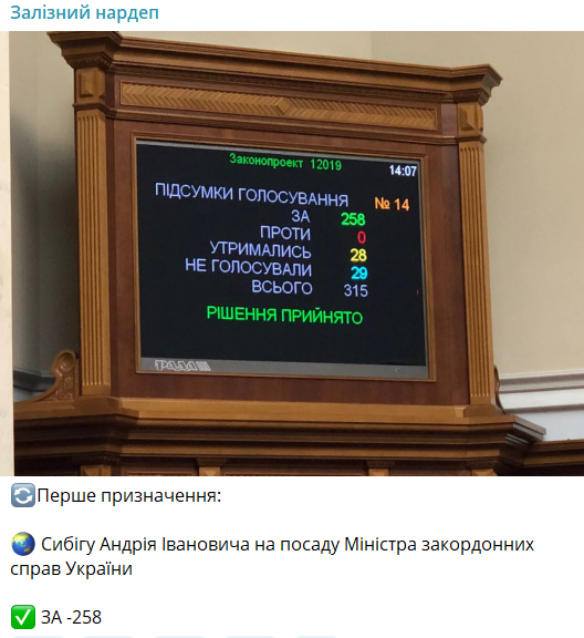 В четверг, 5 сентября, Верховная Рада утвердила Андрея Сибигу новым министром иностранных дел Украины. Об этом сообщает народный депутат Ярослав Железняк.