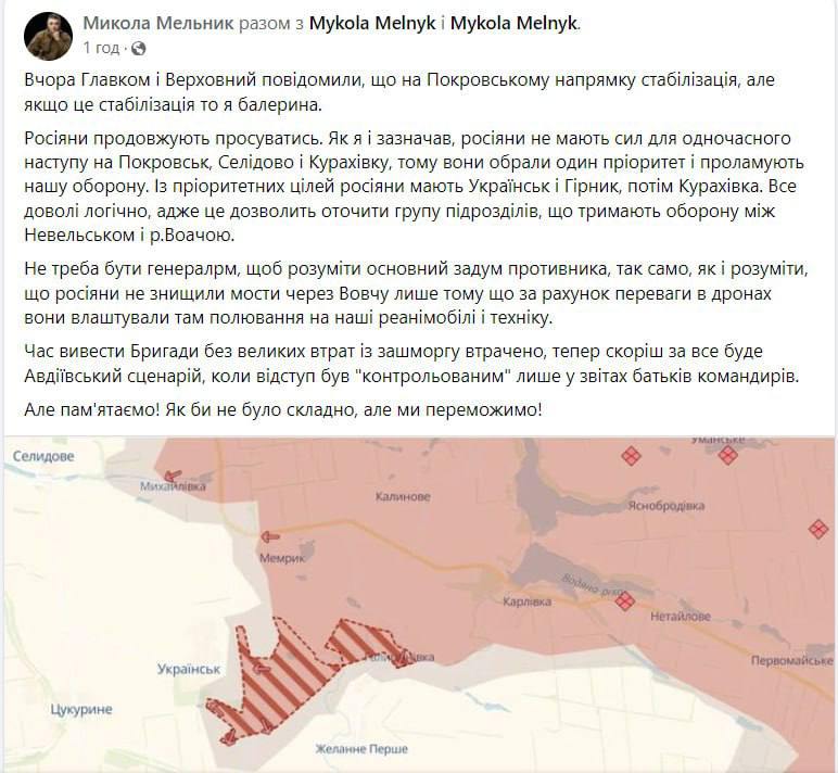 "Вчера главком (Сырский - Ред.) и верховный (Зеленский - Ред.) сообщили, что на Покровском направлении стабилизация, но если это стабилизация, то я балерина. Россияне продолжают продвигаться", - написал командир роты.