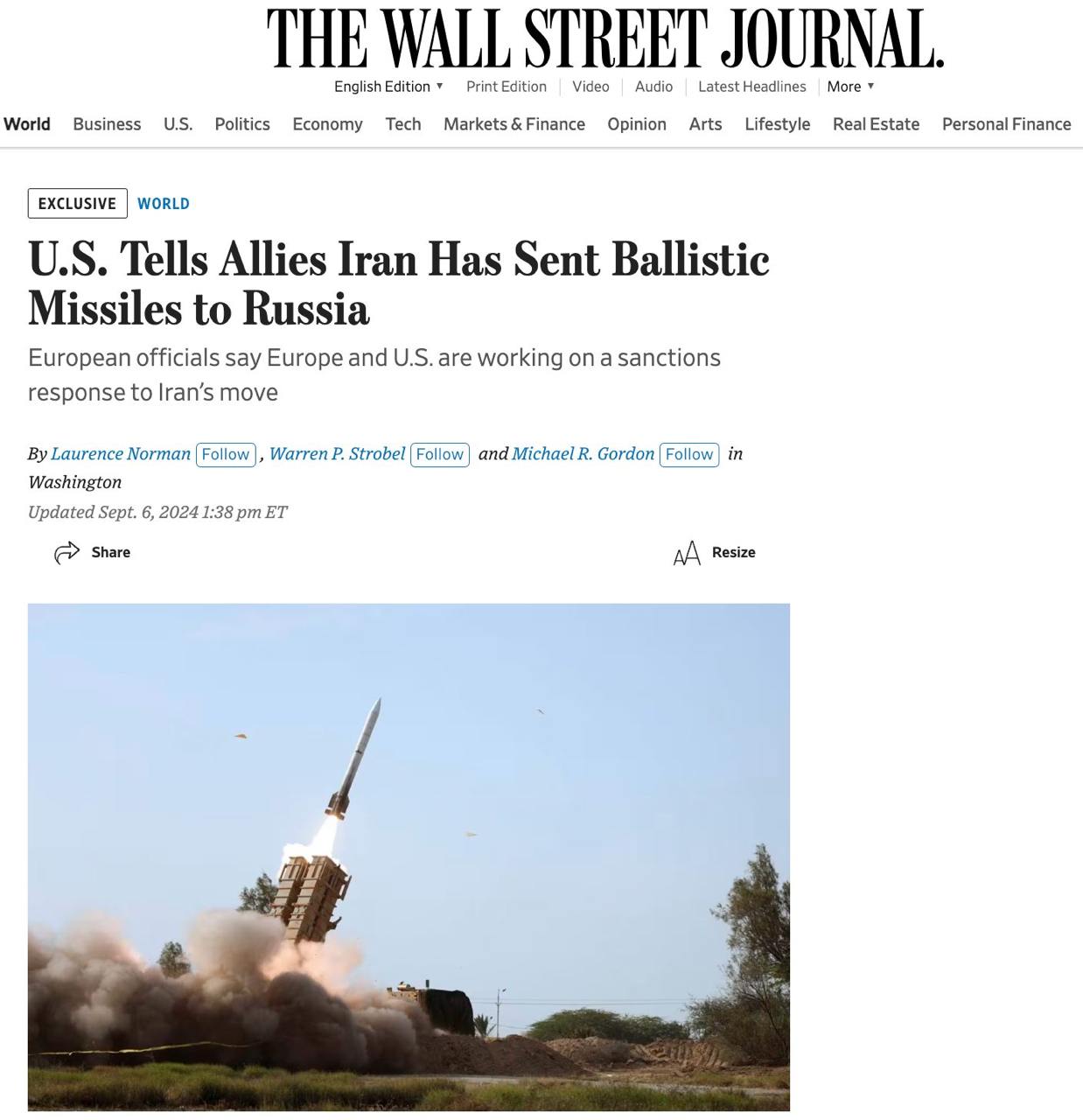 "Иран отправил в Россию баллистические ракеты малой дальности, что даст Москве еще один мощный военный инструмент для использования в войне против Украины. Этот шаг последовал за строгими предупреждениями Запада не поставлять это оружие Москве", - написано в статье.